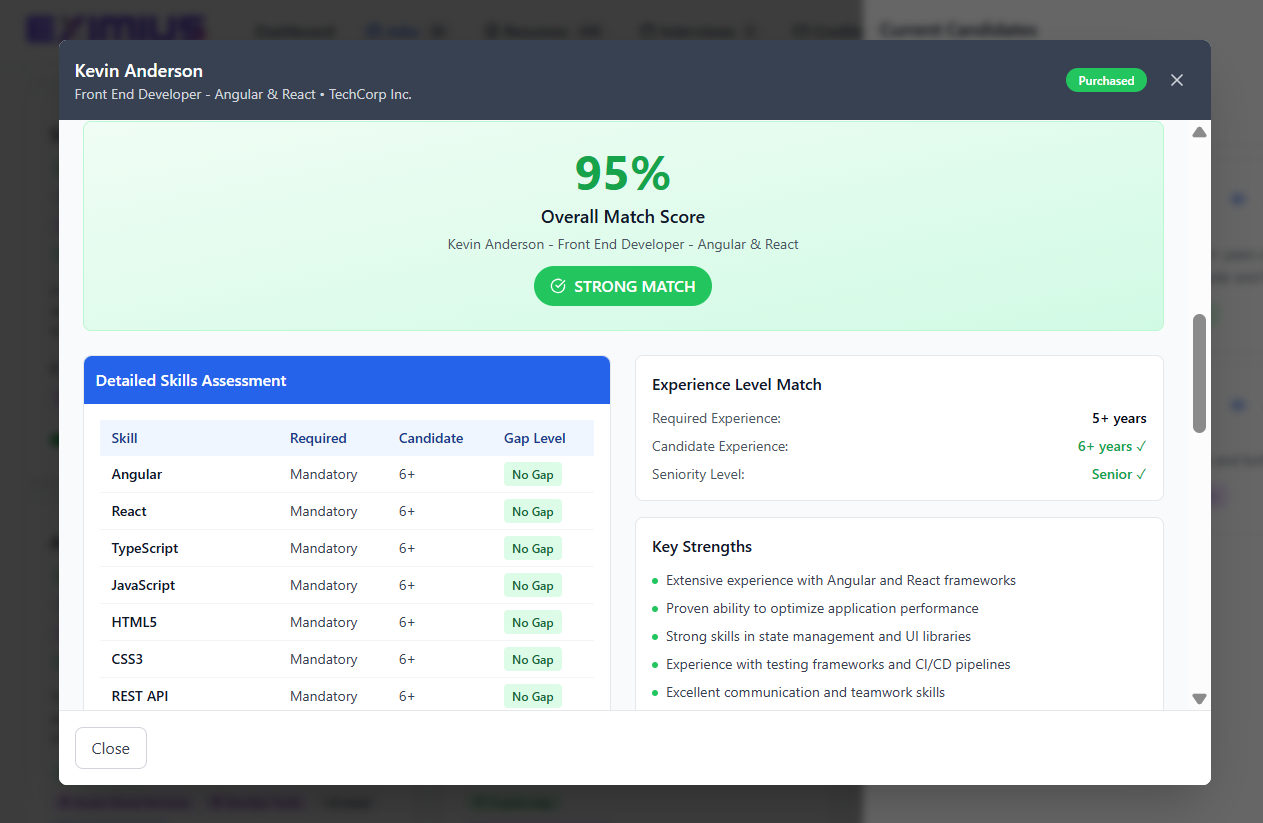 See why each candidate made the shortlist. Eximius highlights strengths, improvement areas, and overall readiness, giving recruiters a clear view of interview potential at a glance.